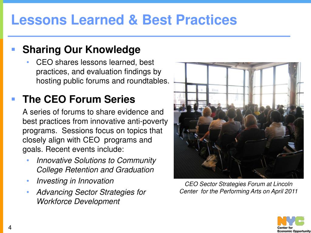 Lessons Learned & Best Practices • Sharing Our Knowledge • CEO shares lessons learned, best practices, and evaluation findings by hosting public forums and roundtables. • The CEO Forum Series A series of forums to share evidence and best practices from innovative anti-poverty programs. Sessions focus on topics that closely align with CEO programs and goals. Recent events include: • Innovative Solutions to Community College Retention and Graduation • Investing in Innovation • Advancing Sector Strategies for Workforce Development CEO Sector Strategies Forum at Lincoln Center for the Performing Arts on April 2011