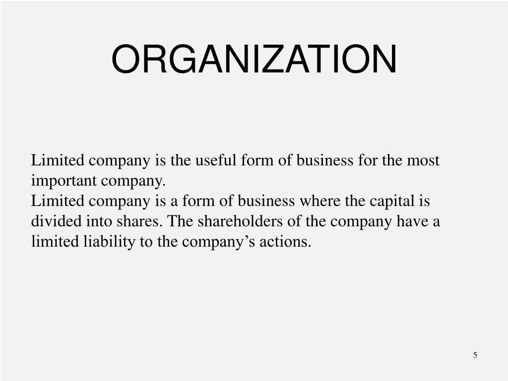 ORGANIZATION • Limited company is the useful form of business for the most important company. • Limited company is a form of business where the capital is divided into shares. The shareholders of the company have a limited liability to the company’s actions.
