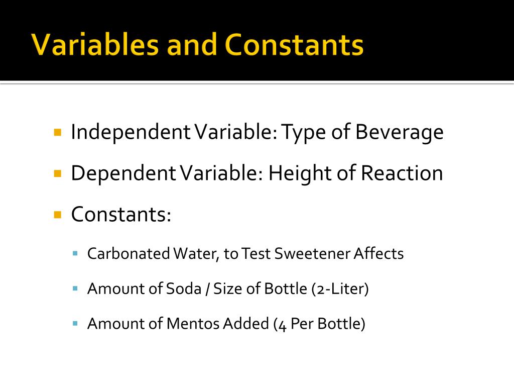 Variables and Constants • Independent Variable: Type of Beverage • Dependent Variable: Height of Reaction • Constants: • Carbonated Water, to Test Sweetener Affects • Amount of Soda / Size of Bottle (2-Liter) • Amount of Mentos Added (4 Per Bottle)