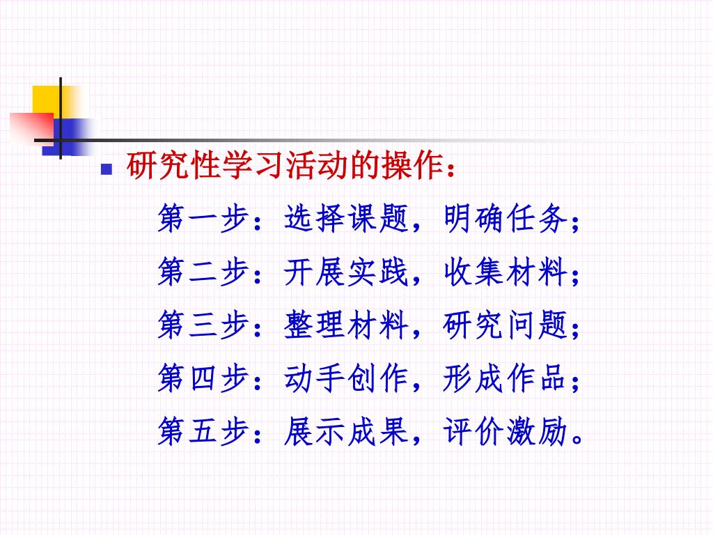 研究性学习活动的操作: 第一步:选择课题,明确任务; 第二步:开展实践,收集材料; 第三步:整理材料,研究问题; 第四步:动手创作,形成作品; 第五步:展示成果,评价激励。
