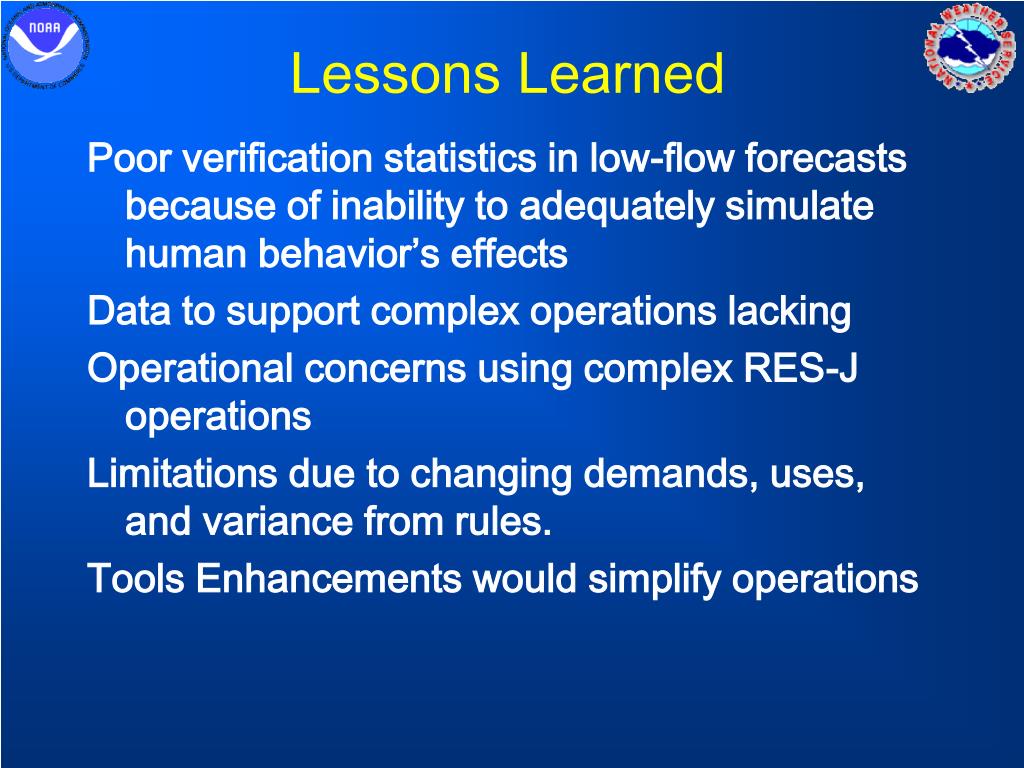 Lessons Learned Poor verification statistics in low-flow forecasts because of inability to adequately simulate human behavior’s effects Data to support complex operations lacking Operational concerns using complex RES-J operations Limitations due to changing demands, uses, and variance from rules. Tools Enhancements would simplify operations