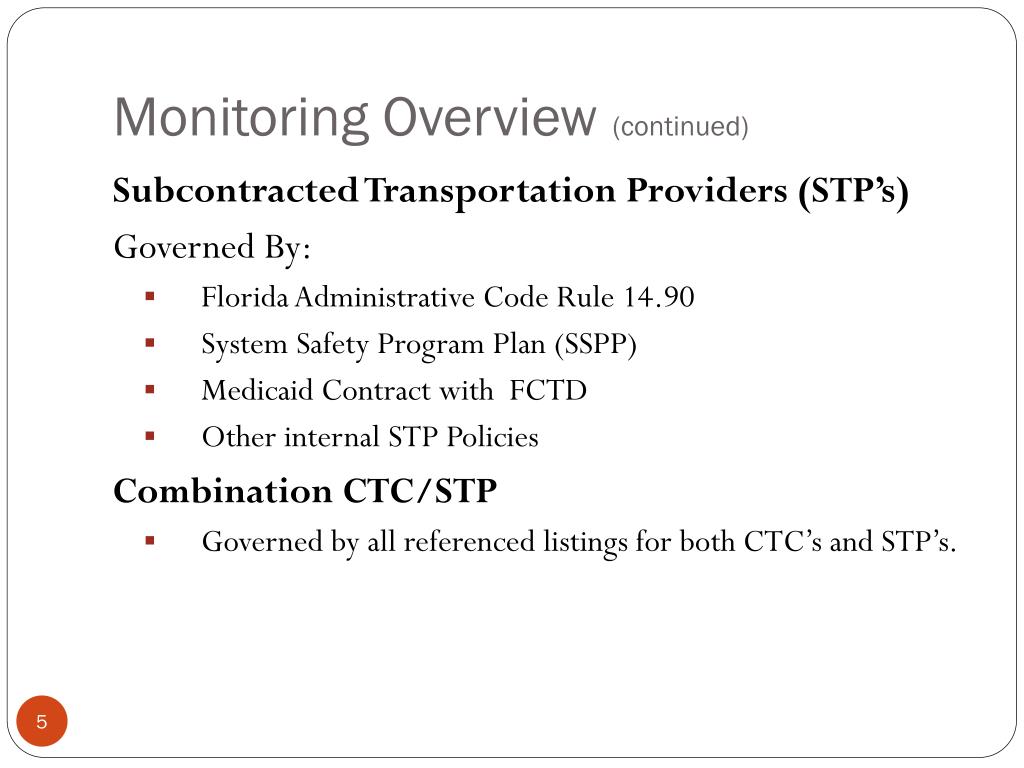 Monitoring Overview (continued) Subcontracted Transportation Providers (STP’s) Governed By: • Florida Administrative Code Rule 14.90 • System Safety Program Plan (SSPP) • Medicaid Contract with FCTD • Other internal STP Policies Combination CTC/STP • Governed by all referenced listings for both CTC’s and STP’s.