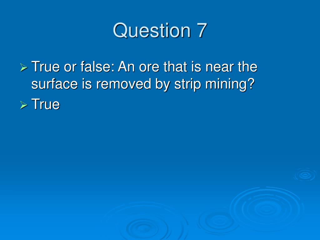 Question 7 • True or false: An ore that is near the surface is removed by strip mining? • True