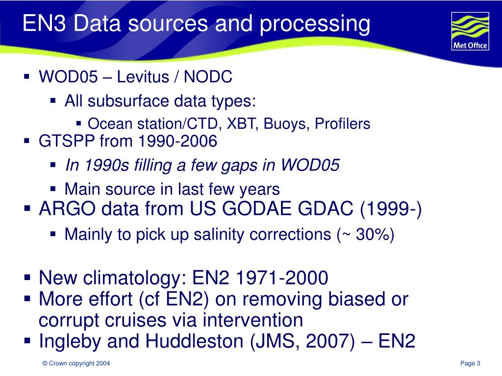 EN3 Data sources and processing • WOD05 – Levitus / NODC • All subsurface data types: • Ocean station/CTD, XBT, Buoys, Profilers • GTSPP from 1990-2006 • In 1990s filling a few gaps in WOD05 • Main source in last few years • ARGO data from US GODAE GDAC (1999-) • Mainly to pick up salinity corrections (~ 30%) • New climatology: EN2 1971-2000 • More effort (cf EN2) on removing biased or corrupt cruises via intervention • Ingleby and Huddleston (JMS, 2007) – EN2