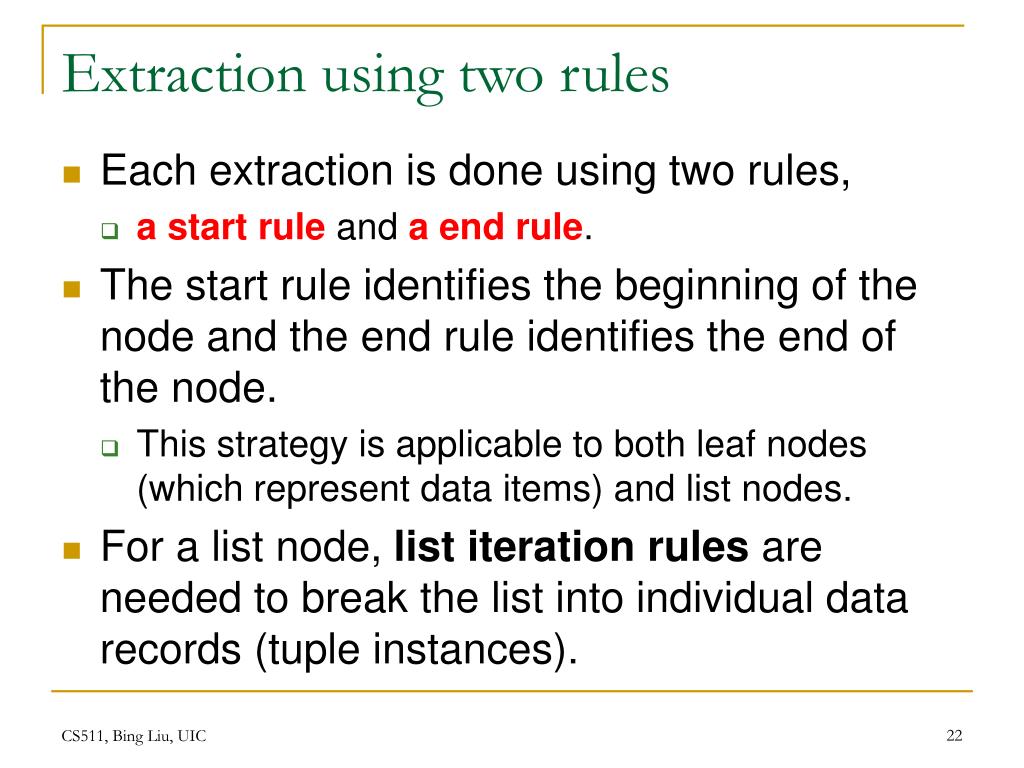 Extraction using two rules • Each extraction is done using two rules, • a start rule and a end rule. • The start rule identifies the beginning of the node and the end rule identifies the end of the node. • This strategy is applicable to both leaf nodes (which represent data items) and list nodes. • For a list node, list iteration rules are needed to break the list into individual data records (tuple instances). CS511, Bing Liu, UIC