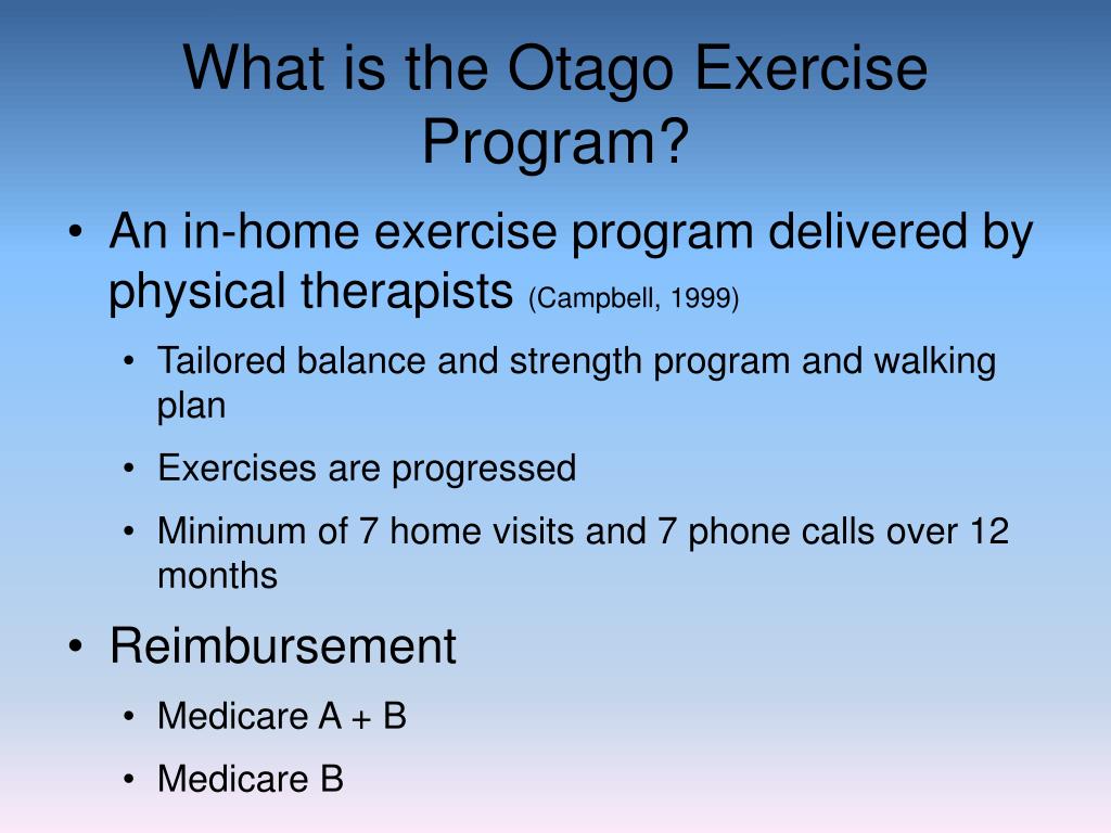 What is the Otago Exercise Program? • An in-home exercise program delivered by physical therapists (Campbell, 1999) • Tailored balance and strength program and walking plan • Exercises are progressed • Minimum of 7 home visits and 7 phone calls over 12 months • Reimbursement • Medicare A + B • Medicare B