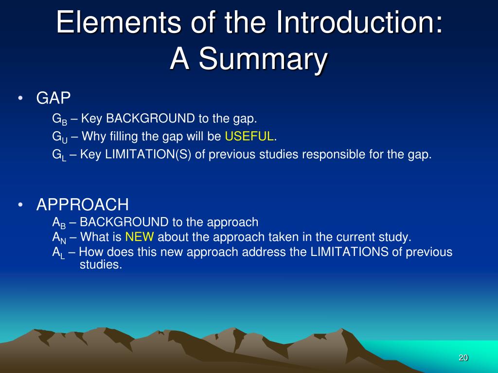 Elements of the Introduction: A Summary • GAP GB – Key BACKGROUND to the gap. GU – Why filling the gap will be USEFUL. GL – Key LIMITATION(S) of previous studies responsible for the gap. • APPROACH AB – BACKGROUND to the approach AN – What is NEW about the approach taken in the current study. AL – How does this new approach address the LIMITATIONS of previous studies.