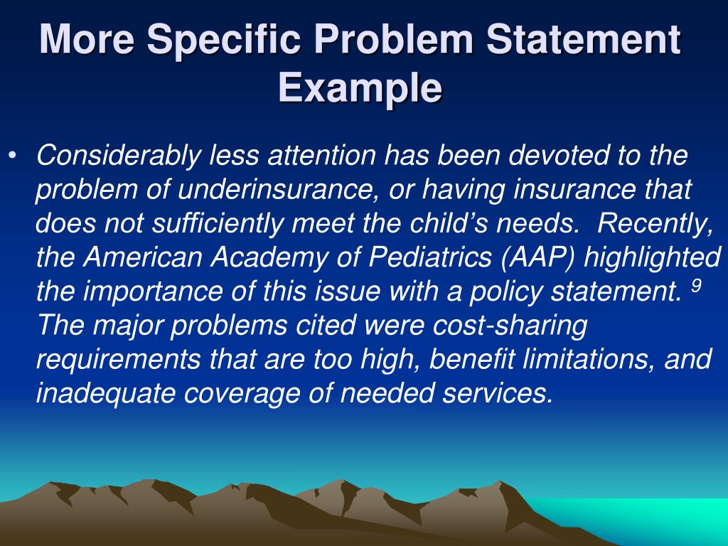 More Specific Problem Statement Example • Considerably less attention has been devoted to the problem of underinsurance, or having insurance that does not sufficiently meet the child’s needs. Recently, the American Academy of Pediatrics (AAP) highlighted the importance of this issue with a policy statement. 9 The major problems cited were cost-sharing requirements that are too high, benefit limitations, and inadequate coverage of needed services.