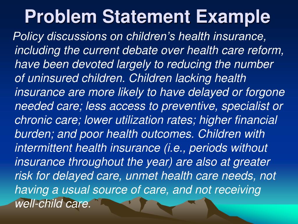 Problem Statement Example Policy discussions on children’s health insurance, including the current debate over health care reform, have been devoted largely to reducing the number of uninsured children. Children lacking health insurance are more likely to have delayed or forgone needed care; less access to preventive, specialist or chronic care; lower utilization rates; higher financial burden; and poor health outcomes. Children with intermittent health insurance (i.e., periods without insurance throughout the year) are also at greater risk for delayed care, unmet health care needs, not having a usual source of care, and not receiving well-child care.