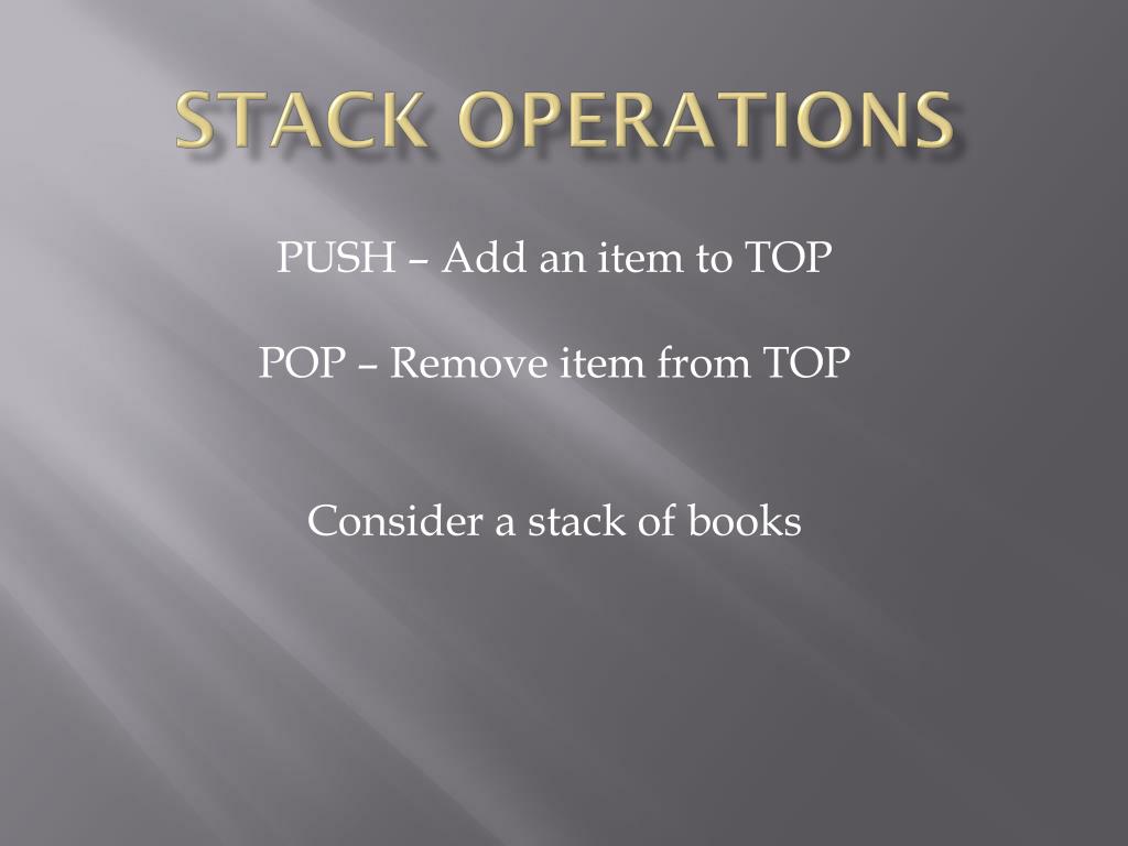 Stack Operations PUSH – Add an item to TOPPOP – Remove item from TOPConsider a stack of books
