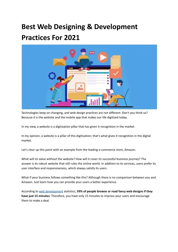 Best Web Designing & Development Practices For 2021 Technologies keep on changing, and web design practices are not different. Don't you think so? Because it is the website and the mobile app that makes our life digitized today. In my view, a website is a digitization pillar that has given it recognition in the market. In my opinion, a website is a pillar of this digitization; that’s what gives it recognition in the digital market. Let's clear up this point with an example from the leading e-commerce store, Amazon. What will its value without the website? How will it cover its successful business journey? The answer is its robust website that still rules the online world. In addition to its services, users prefer its user interface and responsiveness, which always satisfy its users. What if your business follows something like this? Although there is no comparison between you and Amazon. Just learn how you can provide your users a better experience. According to web development statistics, 59% of people browse or read fancy web designs if they have just 15 minutes. Therefore, you have only 15 minutes to impress your users and encourage them to make a deal.