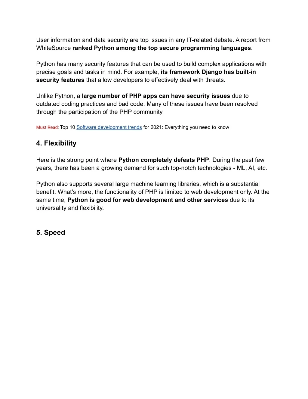 User information and data security are top issues in any IT-related debate. A report from WhiteSource ranked Python among the top secure programming languages. Python has many security features that can be used to build complex applications with precise goals and tasks in mind. For example, its framework Django has built-in security features that allow developers to effectively deal with threats. Unlike Python, a large number of PHP apps can have security issues due to outdated coding practices and bad code. Many of these issues have been resolved through the participation of the PHP community. Must Read: Top 10 Software development trends for 2021: Everything you need to know 4. Flexibility Here is the strong point where Python completely defeats PHP. During the past few years, there has been a growing demand for such top-notch technologies - ML, AI, etc. Python also supports several large machine learning libraries, which is a substantial benefit. What's more, the functionality of PHP is limited to web development only. At the same time, Python is good for web development and other services due to its universality and flexibility. 5. Speed