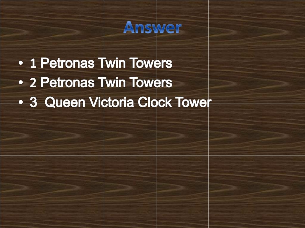 14. Answer • 1Petronas Twin Towers • 2Petronas Twin Towers • 3 Queen Victoria Clock Tower