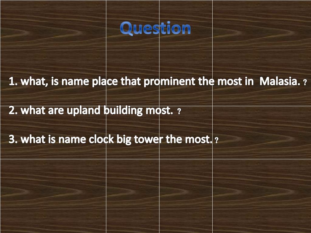 12. Question 1. what, is name place that prominent the most in Malasia. ? 2. what are upland building most. ? 3. what is name clock big tower the most. ?