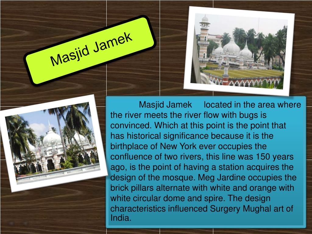 10. MasjidJamek MasjidJamek located in the area where the river meets the river flow with bugs is convinced. Which at this point is the point that has historical significance because it is the birthplace of New York ever occupies the confluence of two rivers, this line was 150 years ago, is the point of having a station acquires the design of the mosque. Meg Jardine occupies the brick pillars alternate with white and orange with white circular dome and spire. The design characteristics influenced Surgery Mughal art of India.