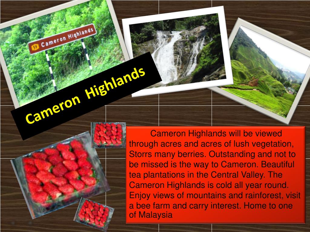 11. Cameron Highlands Cameron Highlands will be viewed through acres and acres of lush vegetation, Storrs many berries. Outstanding and not to be missed is the way to Cameron. Beautiful tea plantations in the Central Valley. The Cameron Highlands is cold all year round. Enjoy views of mountains and rainforest, visit a bee farm and carry interest. Home to one of Malaysia