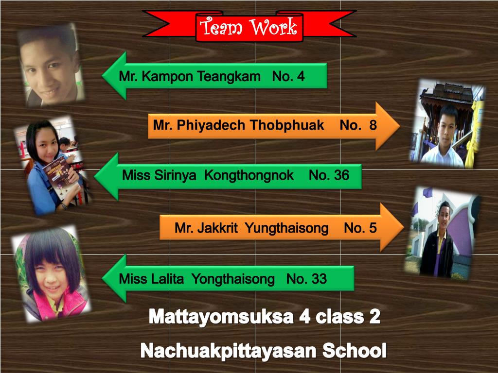 13. Team Work Mr. KamponTeangkam No. 4 Mr. PhiyadechThobphuak No. 8 Miss SirinyaKongthongnok No. 36 Mr. JakkritYungthaisong No. 5 Miss LalitaYongthaisong No. 33 Mattayomsuksa 4 class 2 Nachuakpittayasan School