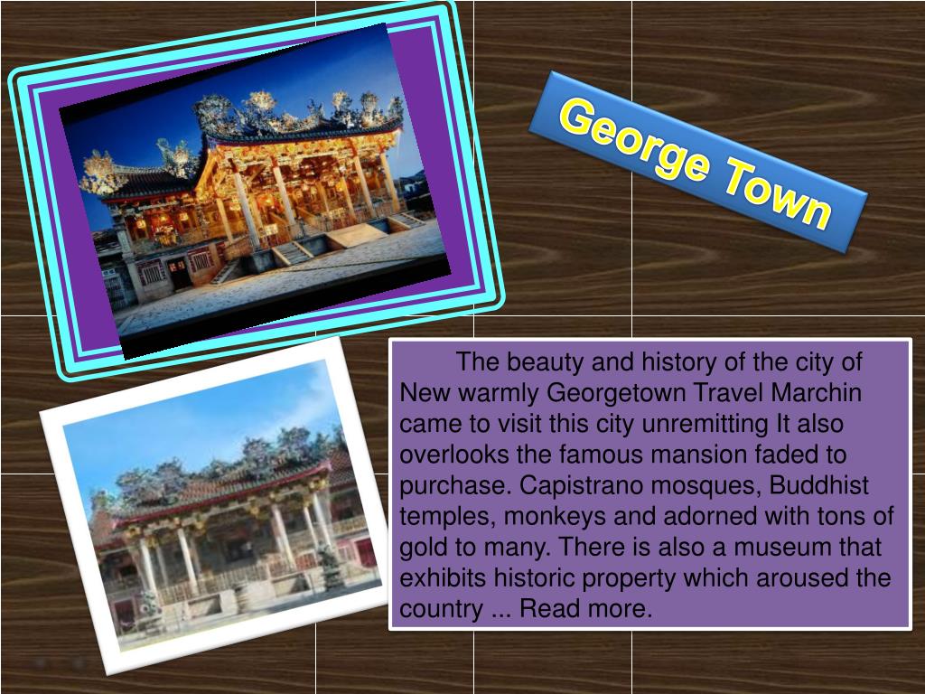 9. George Town The beauty and history of the city of New warmly Georgetown Travel Marchin came to visit this city unremitting It also overlooks the famous mansion faded to purchase. Capistrano mosques, Buddhist temples, monkeys and adorned with tons of gold to many. There is also a museum that exhibits historic property which aroused the country ... Read more.