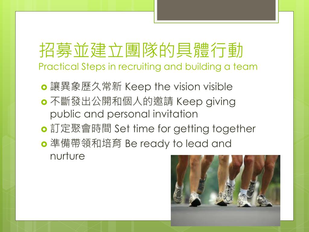 招募並建立團隊的具體行動Practical Steps in recruiting and building a team • 讓異象歷久常新 Keep the vision visible • 不斷發出公開和個人的邀請 Keep giving public and personal invitation • 訂定聚會時間 Set time for getting together • 準備帶領和培育 Be ready to lead and nurture
