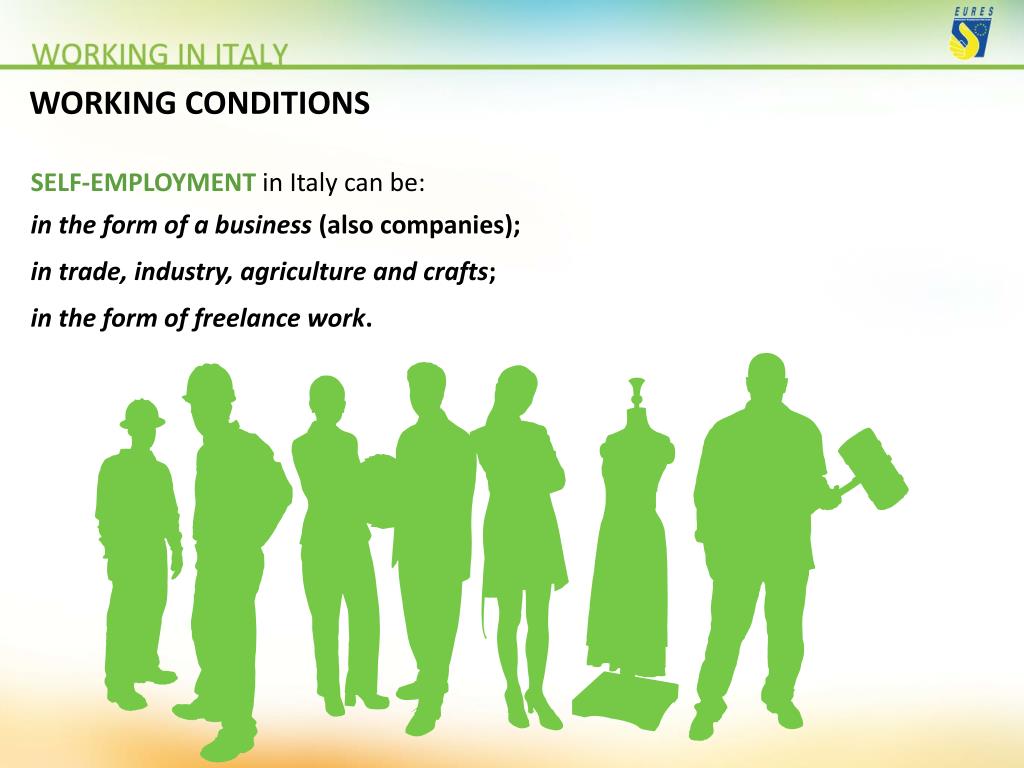 WORKING CONDITIONS SELF-EMPLOYMENT in Italy can be: in the form of a business (also companies); in trade, industry, agriculture and crafts; in the form of freelance work.