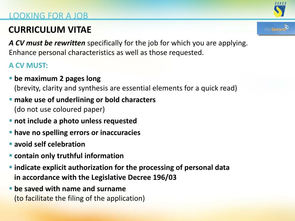CURRICULUM VITAE • A CV must be rewritten specifically for the job for which you are applying. • Enhance personal characteristics as well as those requested. • A CV MUST: • be maximum 2 pages long • (brevity, clarity and synthesis are essential elements for a quick read) • make use of underlining or bold characters • (do not use coloured paper) • not include a photo unless requested • have no spelling errors or inaccuracies • avoid self celebration • contain only truthful information • indicate explicit authorization for the processing of personal data • in accordance with the Legislative Decree 196/03 • be saved with name and surname • (to facilitate the filing of the application)