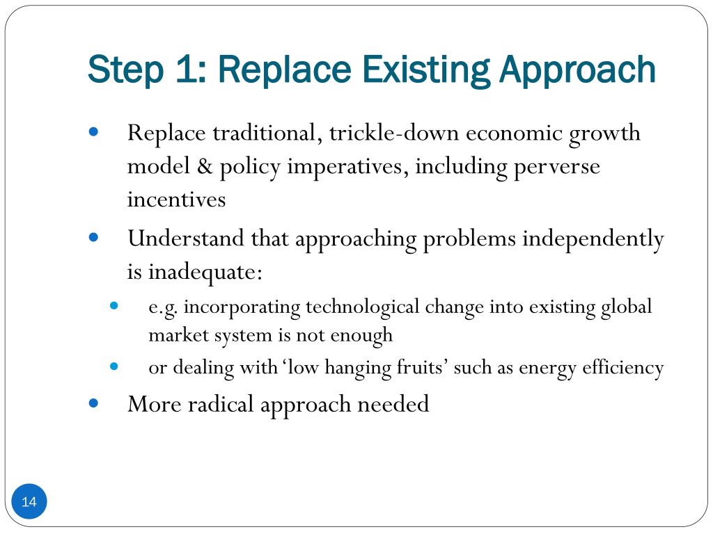Step 1: Replace Existing Approach • Replace traditional, trickle-down economic growth model & policy imperatives, including perverse incentives • Understand that approaching problems independently is inadequate: • e.g. incorporating technological change into existing global market system is not enough • or dealing with ‘low hanging fruits’ such as energy efficiency • More radical approach needed