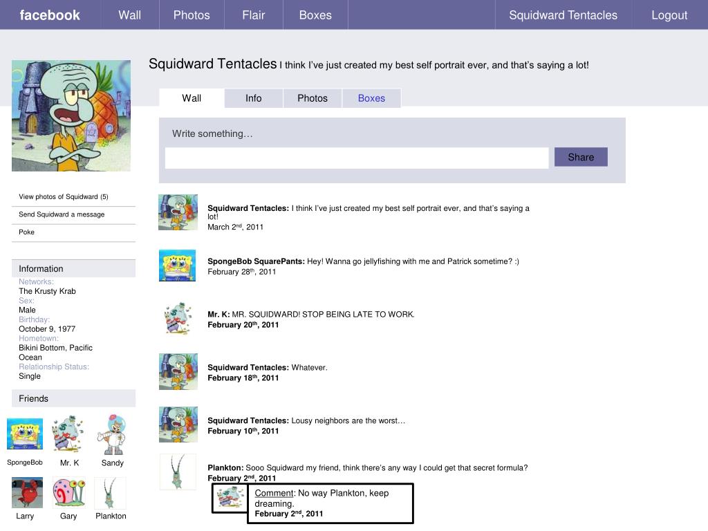 Wall Photos Flair Boxes Squidward Tentacles Logout Wall Info Photos Boxes Write something… Share facebook View photos of Squidward (5) Squidward Tentacles: I think I’ve just created my best self portrait ever, and that’s saying a lot! March 2nd, 2011 Send Squidward a message Poke SpongeBob SquarePants: Hey! Wanna go jellyfishing with me and Patrick sometime? :) February 28th, 2011 Information Networks: The KrustyKrab Sex: Male Birthday: October 9, 1977 Hometown: Bikini Bottom, Pacific Ocean Relationship Status: Single Squidward Tentacles I think I’ve just created my best self portrait ever, and that’s saying a lot! Mr. K: MR. SQUIDWARD! STOP BEING LATE TO WORK. February 20th, 2011 Squidward Tentacles:Whatever. February 18th, 2011 Friends Squidward Tentacles: Lousy neighbors are the worst… February 10th, 2011 SpongeBob Mr. K Sandy Plankton:SoooSquidward my friend, think there’s any way I could get that secret formula? February 2nd, 2011 Comment: No wayPlankton, keepdreaming. February 2nd, 2011 Larry Gary Plankton