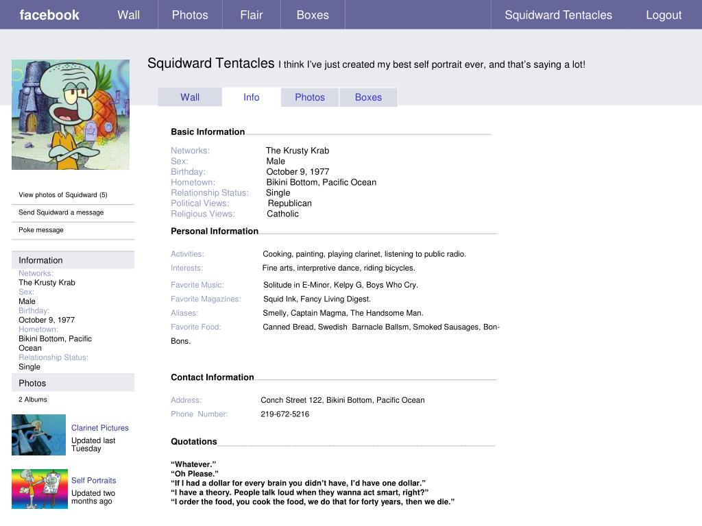 Wall Photos Flair Boxes Squidward Tentacles Logout Wall Info Photos Boxes Basic Information Networks: The KrustyKrab Sex: Male Birthday: October 9, 1977 Hometown: Bikini Bottom, Pacific Ocean Relationship Status: Single Political Views: Republican Religious Views: Catholic facebook View photos of Squidward (5) Send Squidward a message Poke message Personal Information Activities: Cooking, painting, playing clarinet, listening to public radio. Interests: Fine arts, interpretive dance, riding bicycles. Favorite Music: Solitude in E-Minor, Kelpy G, Boys Who Cry. Favorite Magazines: Squid Ink, Fancy Living Digest. Aliases: Smelly, Captain Magma, The Handsome Man. Favorite Food: Canned Bread, Swedish Barnacle Ballsm, Smoked Sausages, Bon-Bons. Information Networks: The Krusty Krab Sex: Male Birthday: October 9, 1977 Hometown: Bikini Bottom, Pacific Ocean Relationship Status: Single Squidward Tentacles I think I’ve just created my best self portrait ever, and that’s saying a lot! Contact Information Photos 2 Albums Address: Conch Street 122, Bikini Bottom, Pacific Ocean Phone Number: 219-672-5216 Clarinet Pictures Updated last Tuesday Quotations_________________________________________________________ “Whatever.” “Oh Please.” “If I had a dollar for every brain you didn’t have, I’d have one dollar.” “I have a theory. People talk loud when they wanna act smart, right?” “I order the food, you cook the food, we do that for forty years, then we die.” Self Portraits Updated two months ago