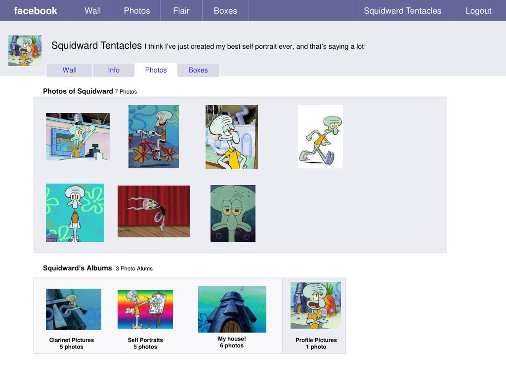 Wall Photos Flair Boxes Squidward Tentacles Logout Squidward Tentacles I think I’ve just created my best self portrait ever, and that’s saying a lot! Wall Info Photos Boxes Photos of Squidward7 Photos facebook Squidward’s Albums3Photo Alums My house! 6 photos Clarinet Pictures 5 photos Self Portraits 5 photos Profile Pictures 1 photo