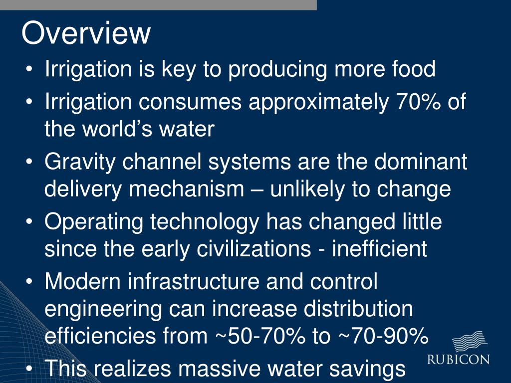 Overview • Irrigation is key to producing more food • Irrigation consumes approximately 70% of the world’s water • Gravity channel systems are the dominant delivery mechanism – unlikely to change • Operating technology has changed little since the early civilizations - inefficient • Modern infrastructure and control engineering can increase distribution efficiencies from ~50-70% to ~70-90% • This realizes massive water savings
