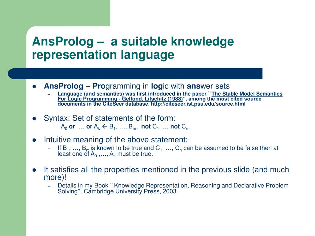 AnsProlog – a suitable knowledge representation language • AnsProlog – Programming in logic with answer sets • Language (and semantics) was first introduced in the paper ``The Stable Model Semantics For Logic Programming - Gelfond, Lifschitz (1988)’’, among the most cited source documents in the CiteSeer database. http://citeseer.ist.psu.edu/source.html • Syntax: Set of statements of the form: A0or … or Ak B1, …, Bm, not C1, … not Cn. • Intuitive meaning of the above statement: • If B1, …, Bm is known to be true and C1, …, Cn can be assumed to be false then at least one of A0 ,…, Akmust be true. • It satisfies all the properties mentioned in the previous slide (and much more)! • Details in my Book ``Knowledge Representation, Reasoning and Declarative Problem Solving’’. Cambridge University Press, 2003.