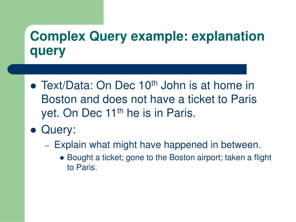 Complex Query example: explanation query • Text/Data: On Dec 10th John is at home in Boston and does not have a ticket to Paris yet. On Dec 11th he is in Paris. • Query: • Explain what might have happened in between. • Bought a ticket; gone to the Boston airport; taken a flight to Paris.