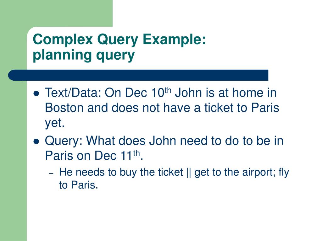 Complex Query Example: planning query • Text/Data: On Dec 10th John is at home in Boston and does not have a ticket to Paris yet. • Query: What does John need to do to be in Paris on Dec 11th. • He needs to buy the ticket || get to the airport; fly to Paris.
