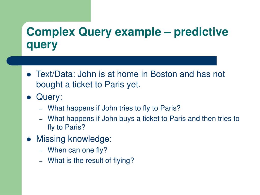 Complex Query example – predictive query • Text/Data: John is at home in Boston and has not bought a ticket to Paris yet. • Query: • What happens if John tries to fly to Paris? • What happens if John buys a ticket to Paris and then tries to fly to Paris? • Missing knowledge: • When can one fly? • What is the result of flying?