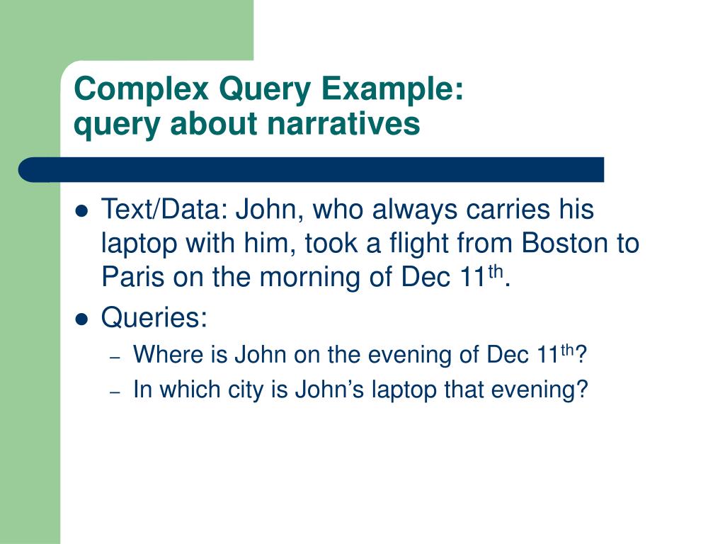 Complex Query Example: query about narratives • Text/Data: John, who always carries his laptop with him, took a flight from Boston to Paris on the morning of Dec 11th. • Queries: • Where is John on the evening of Dec 11th? • In which city is John’s laptop that evening?