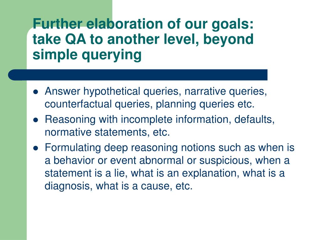 Further elaboration of our goals: take QA to another level, beyond simple querying • Answer hypothetical queries, narrative queries, counterfactual queries, planning queries etc. • Reasoning with incomplete information, defaults, normative statements, etc. • Formulating deep reasoning notions such as when is a behavior or event abnormal or suspicious, when a statement is a lie, what is an explanation, what is a diagnosis, what is a cause, etc.