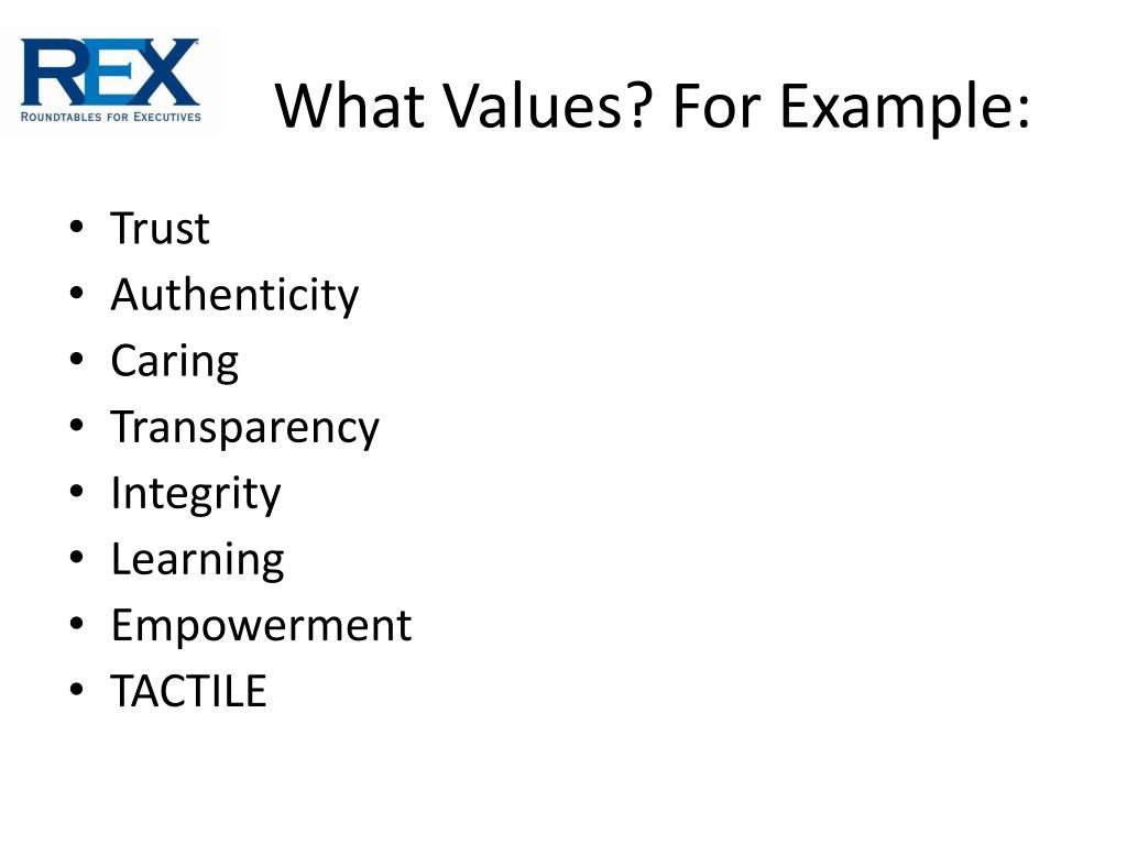 What Values? For Example: • Trust • Authenticity • Caring • Transparency • Integrity • Learning • Empowerment • TACTILE