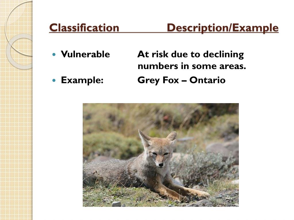 Classification Description/Example • Vulnerable At risk due to declining numbers in some areas. • Example: Grey Fox – Ontario