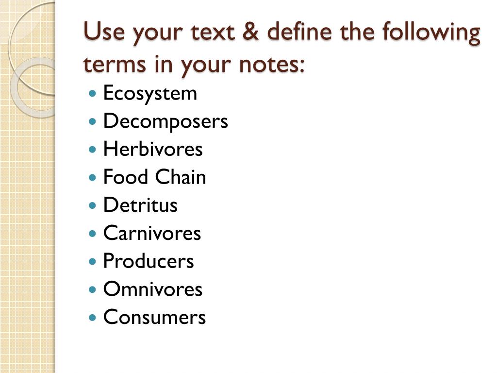 Use your text & define the following terms in your notes: • Ecosystem • Decomposers • Herbivores • Food Chain • Detritus • Carnivores • Producers • Omnivores • Consumers