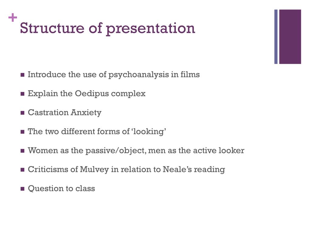 Structure of presentation • Introduce the use of psychoanalysis in films • Explain the Oedipus complex • Castration Anxiety • The two different forms of ‘looking’ • Women as the passive/object, men as the active looker • Criticisms of Mulvey in relation to Neale’s reading • Question to class