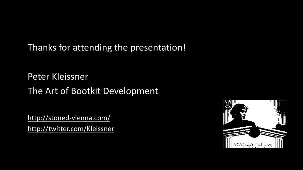 Thanks for attending the presentation! Peter Kleissner The Art of Bootkit Development http://stoned-vienna.com/ http://twitter.com/Kleissner