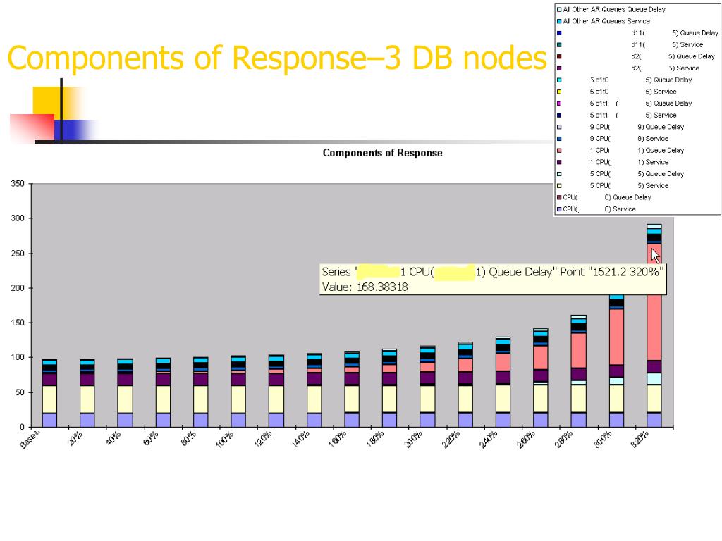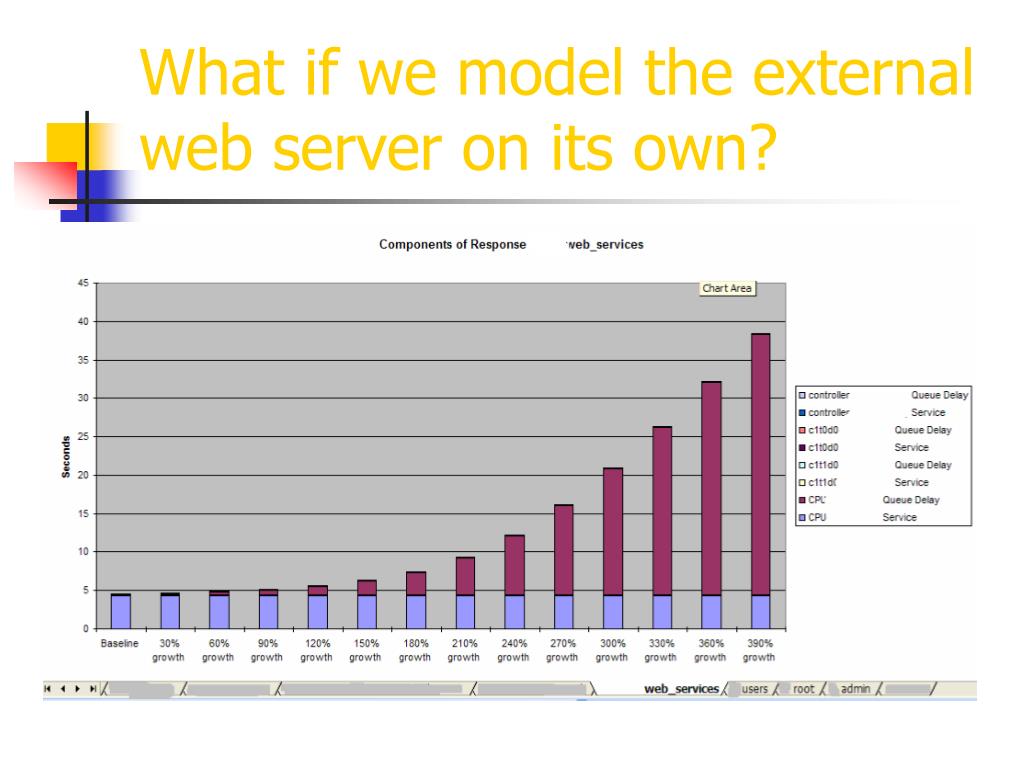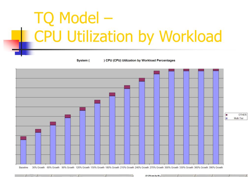 Using TeamQuest Model • The most important decision to make for modeling is “What timeframe do I use to base my model upon?”. • The answer varies upon the peak usage time of the application from both a system resource and business sales perspective. • I use a combination of busiest CPU, I/O and sales to come up with the timeframe to use. • This has worked successfully for me using a 1-hour timeframe to base my modelling upon (5 hour timeframe as well). • Stay away from “problem” times. • Then we apply a growth percentage to that timeframe which equates to what the business said the estimated peak volume would be at their busiest time of year. • We frame the growth % (LT & GT 50%). • If the model did not show any weakness in the infrastructure at 50% growth we created another model with enough growth applied to find a weakness.