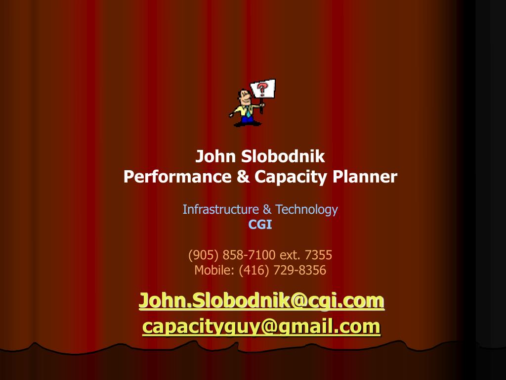 John Slobodnik Performance & Capacity Planner Infrastructure & Technology CGI (905) 858-7100 ext. 7355 Mobile: (416) 729-8356 John.Slobodnik@cgi.com capacityguy@gmail.com