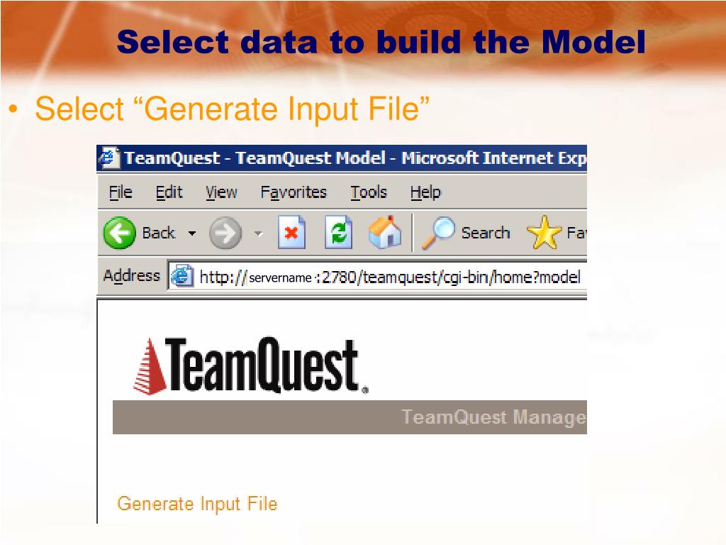 Select data to build the Model • Select “Generate Input File” servername