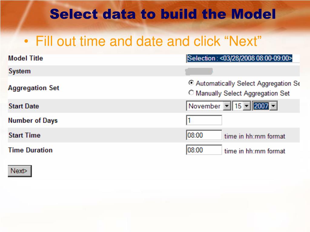Select data to build the Model • Fill out time and date and click “Next” servername