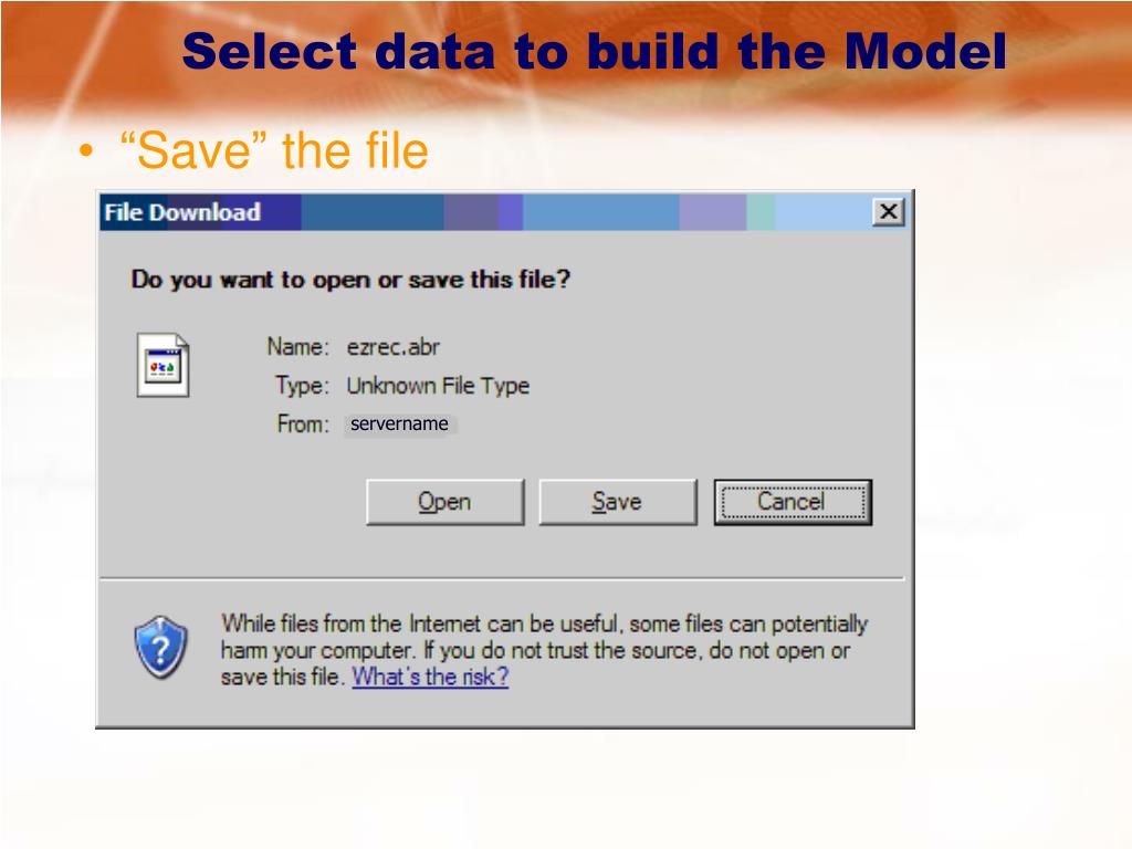 Select data to build the Model • “Save” the file servername