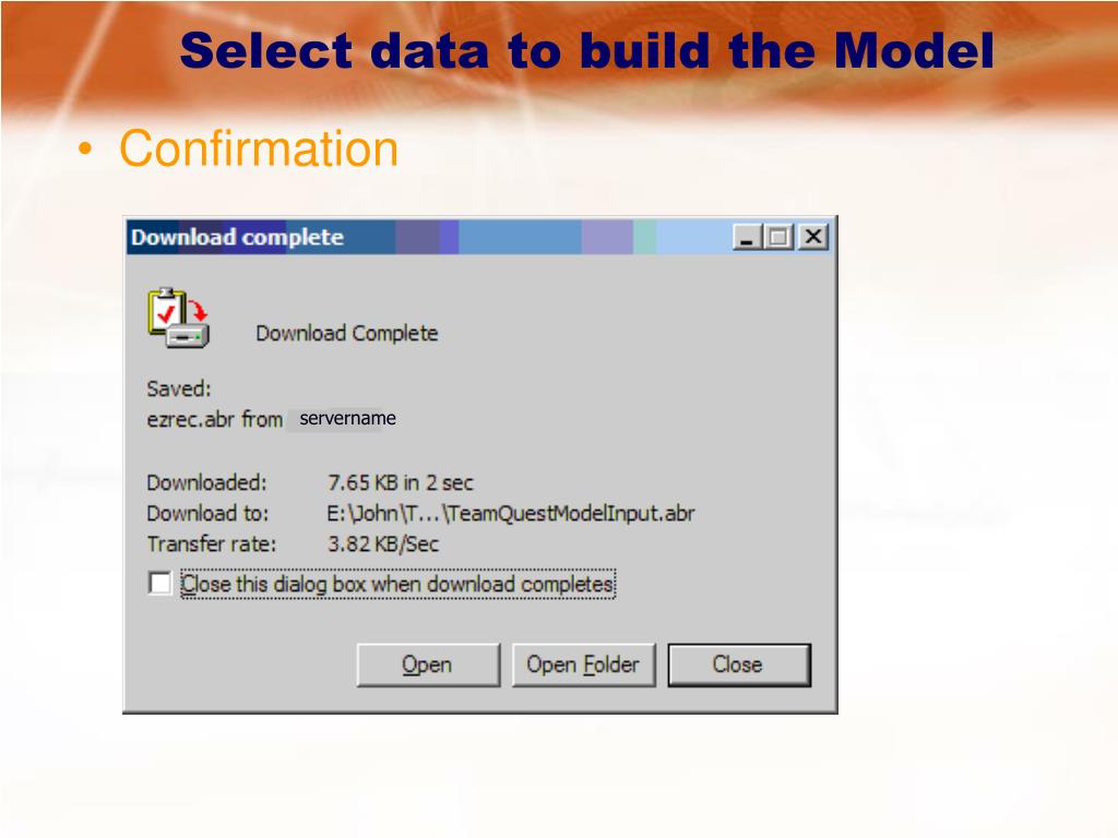Select data to build the Model • Confirmation servername