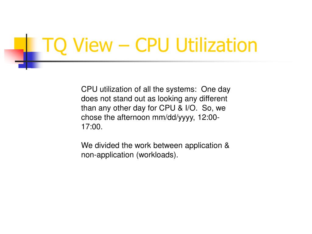 TQ View – CPU Utilization CPU utilization of all the systems: One day does not stand out as looking any different than any other day for CPU & I/O. So, we chose the afternoon mm/dd/yyyy, 12:00-17:00. We divided the work between application & non-application (workloads).