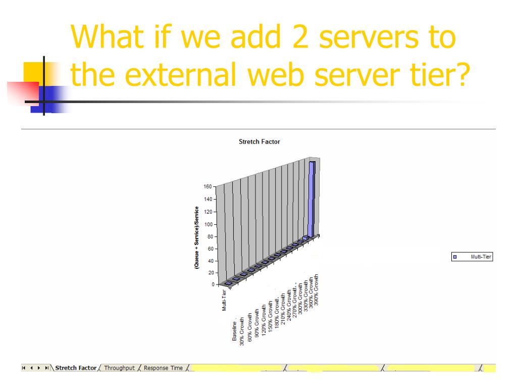 TQ Model - Assumptions • TeamQuest was not installed on all the systems in the environment, so in absence of that data we assume : • External webservers – The 4 Sun servers are load balanced. • WebLogic tier – The 3 Sun servers are load balanced. The 2 Sun WebLogic instances performs twice the work as a single WebLogic instance on the larger Sun server. • Applications such as iPlanet, WebLogic, and Oracle are well instrumented. • The orders are coming from the External Webserver.