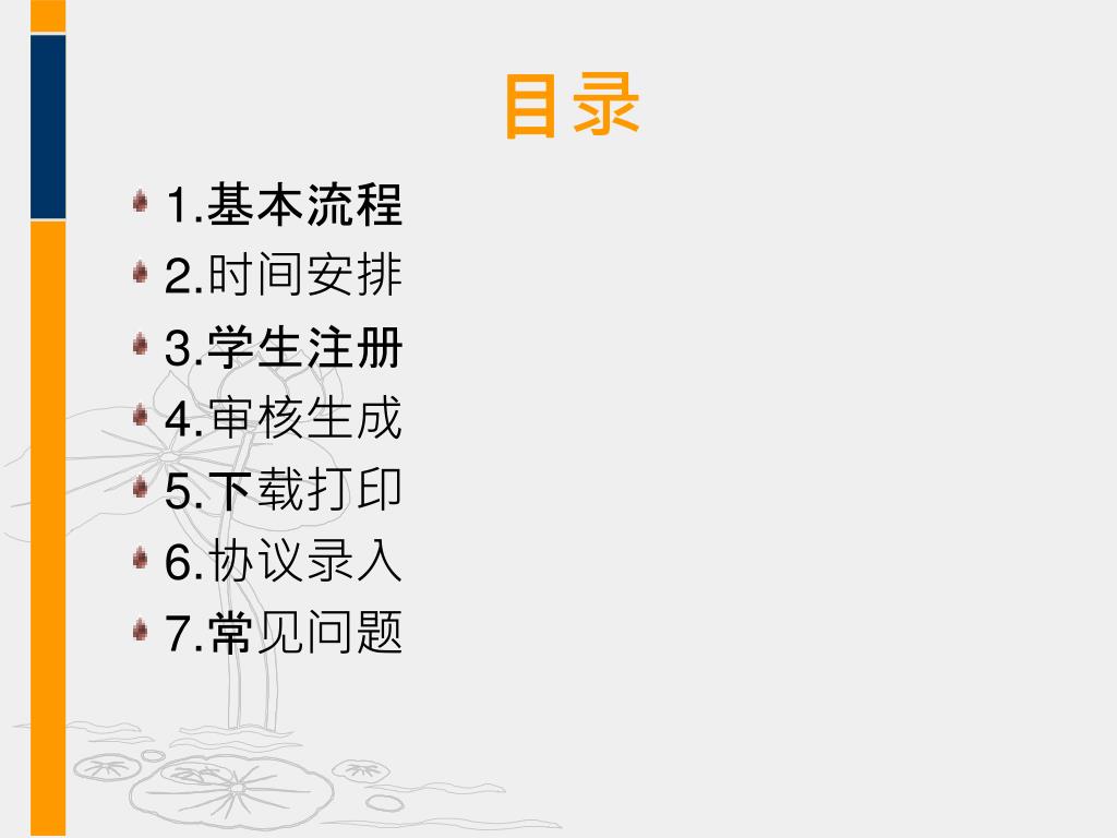 目录 • 1.基本流程 • 2.时间安排 • 3.学生注册 • 4.审核生成 • 5.下载打印 • 6.协议录入 • 7.常见问题